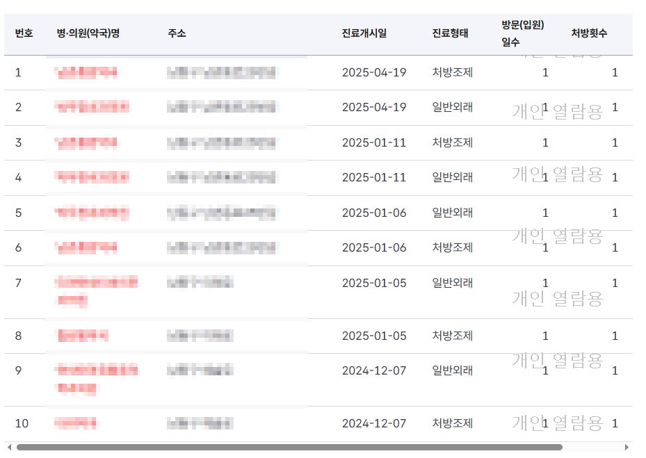 4. 그럼 내가 진료 받은 병원 및 약국 목록이 나온다